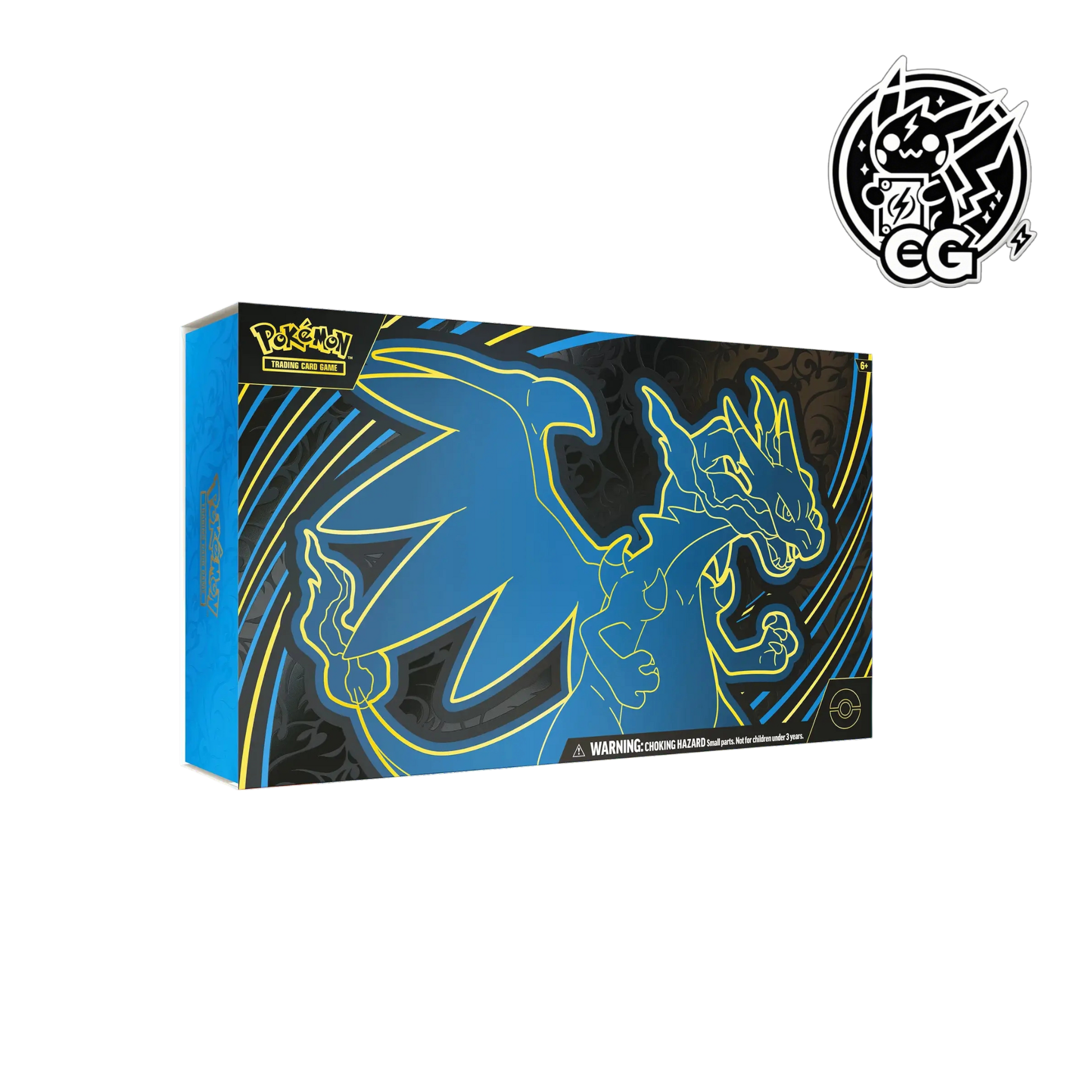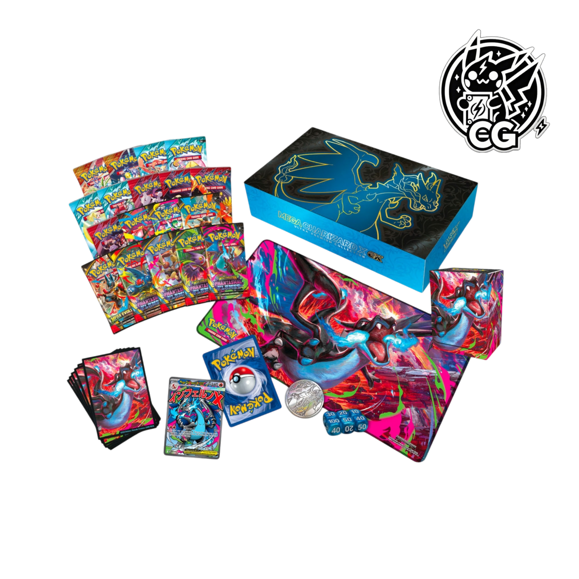 Coffret Ultra Premium Méga Dracaufeu X-ex : 18 boosters multi-séries, tapis collector, deck box, sleeves et accessoires premium aux couleurs de Flammes Fantasmagoriques.